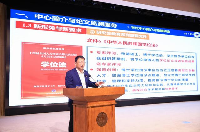 在随后的培训会上,李恒金处长作题为《以精细化高标准论文质量监测服务为基助力研究生教育分类发展》的主旨报告,结合教育部学位与研究生教育发展中心具体操作实践和学位法要求等,围绕如何提升研究生学位论文质量,用数据说话,阐述了学位论文质量监测对研究生教育分类发展的重要意义。